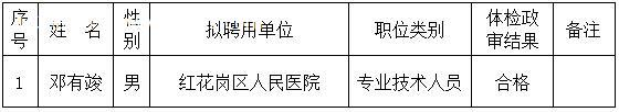 根据《红花岗区事业单位2016年公开招聘研究生简章》(2016年8月4日公布)要求,经过面试、体检、考核(政审)等程序,现拟聘邓有竣同志为红花岗区卫计系统事业单位工作人员,公示时间2016年11月16日至11月22日,公示期间,如有异议,请与红花岗区人力资源和社会保障局事业单位人事管理科联系。