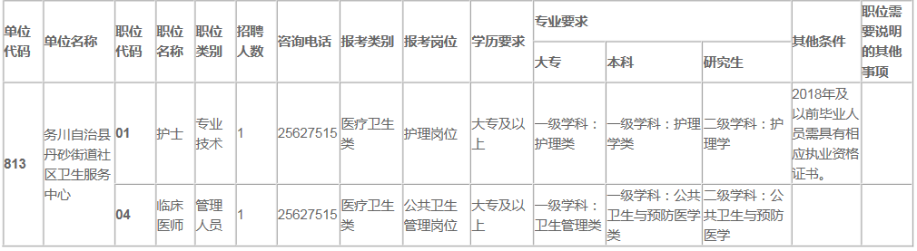 《遵义市2019年上半年公开招聘事业单位人员简章》附件1中,务川自治县丹砂街道社区卫生服务中心(单位代码813)招聘的护士职位(职位代码01)、临床医师职位(职位代码04),现根据招聘工作需要,将以上职位“专业要求”大专专业予以更正公告如下: