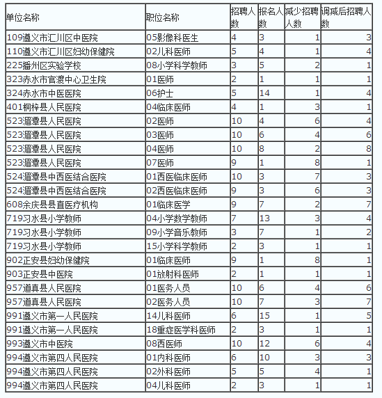 根据《遵义市2019年上半年公开招聘事业单位人员简章》中各招聘职位开考比例和最终报名情况,现将招聘考试职位调减和取消情况公告如下: