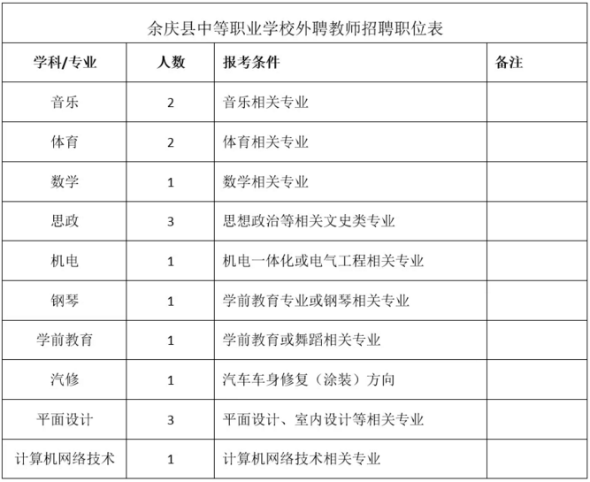 (一)招聘对象1.大专及以上学历的应往届毕业生;2.户籍不限;3.具体要求详见《余庆县中等职业学校外聘教师招聘职位表》。(二)报考条件1.具有中华人民共和国国籍,遵守宪法、法律和法规,品行端正;2.年龄在18周岁及以上;3.具有符合岗位要求的文化程度、工作能力和资格条件;4.具有正常履行职责的身体条件;5.具备招聘岗位所需的其他资格条件。6.文化课教师原则上要求具有本科及以上学历、相同学科教师资格证;专业课教师具有大专及以上学历,相关专业教师资格证或职业资格证,具有3年及以上企业工作经历者可优先录用。(三)以下人员不得报考1.因犯罪受过刑事处罚的;2.不符合招聘对象、报考条件或职位所需资格条件的;3.法律、法规规定不得聘用的。