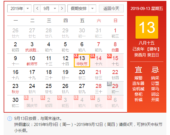 根据国务院办公厅通知精神,现将2019年中秋节放假安排通知如下: