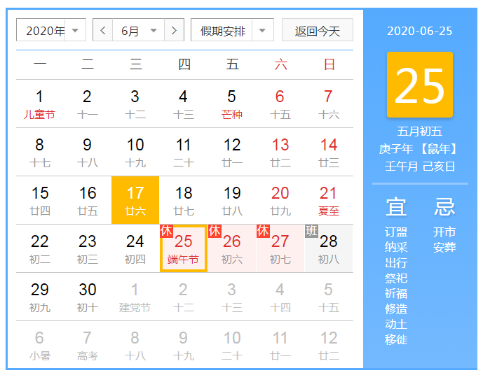 2020年6月25日至6月27日,放假期三天,6月28日(周日)正常上班。